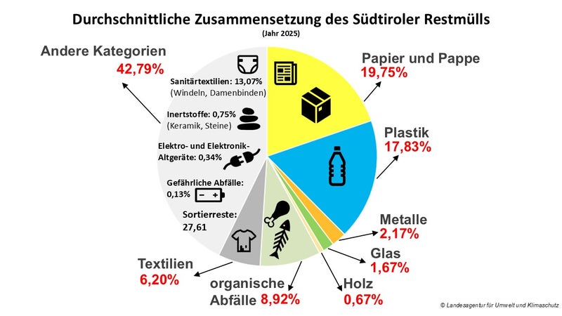 Die Abfallanalyse wurde vom Landesamt für Abfallwirtschaft koordiniert und in Zusammenarbeit mit den Bezirksgemeinschaften, Eco Center AG, SEAB und dem durchgeführt. Von den Siedlungsabfällen aus allen Südtiroler Bezirken und der Stadt Bozen, die eigentlich für die Müllverwertungsanlage in Bozen Süd bestimmt sind, wurden im Zeitraum Oktober-November 2024 an der Mülldeponie Pfatten rund 100 Abfallproben entnommen und vom beauftragten Unternehmen Affidavit GmbH in rund 30 verschiedene Kategorien sortiert, darunter Papier, Karton, Glas, Metalle, Kunststoffe, Biomüll, Grünabfälle, Lebensmittelabfälle usw. Die Sortierdaten wurden in einer Datenbank gesammelt und ausgewertet, wie Roberto Delbuono, Lucia Socini und Marco Bellocchio von der Affidavit GmbH berichteten.