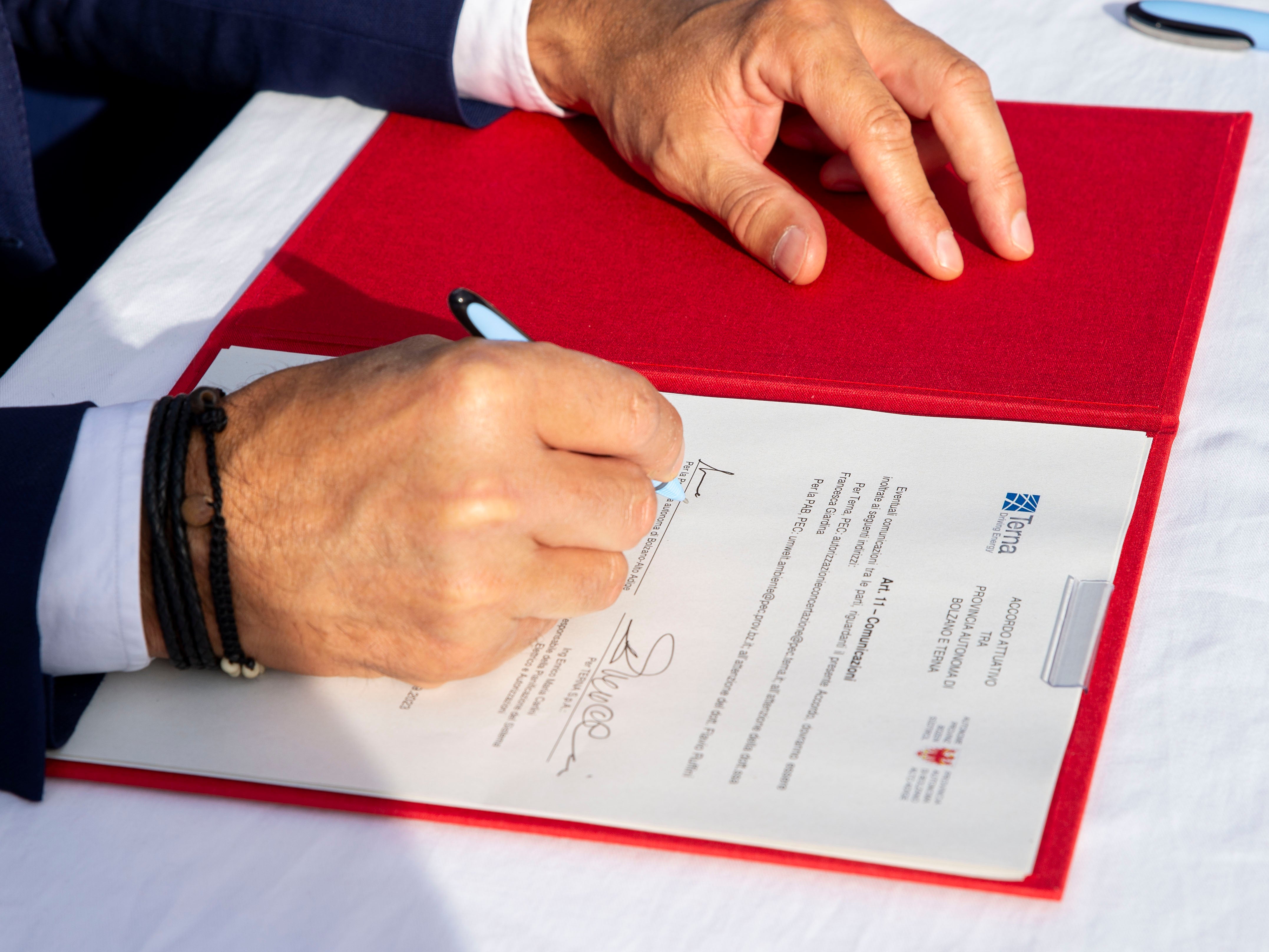 Heute Nachmittag (15. September) folgte in Milland bei Brixen die Unterzeichnung der Umsetzungsvereinbarung durch den Landeshauptmann und durch Enrico Maria Carlini, Leiter der Abteilung Planung und Genehmigungen des Elektrizitätsnetzes von Terna.