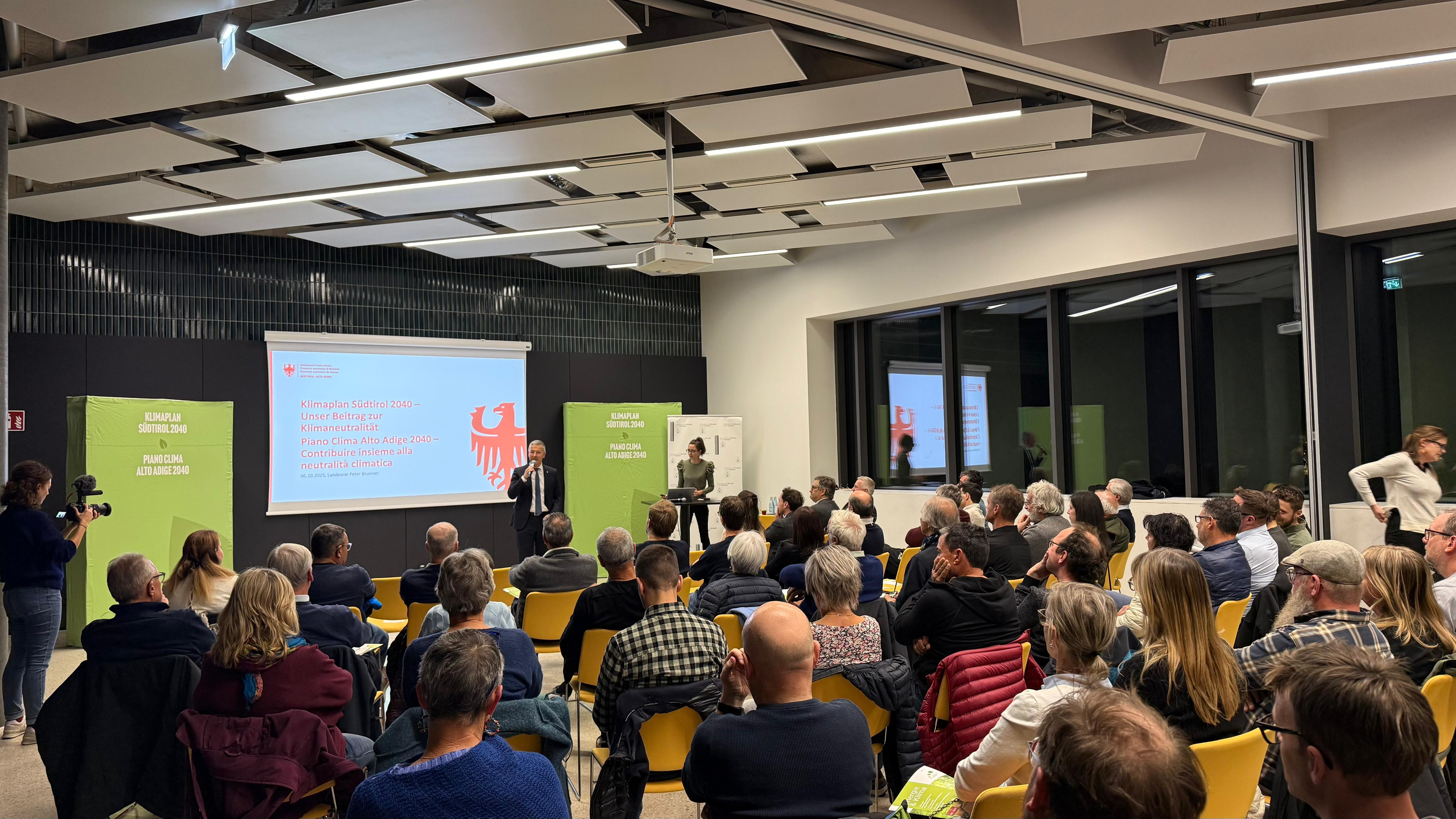 „Südtirol hat sich mit dem Klimaplan Südtirol 2040 das ehrgeizige Ziel gesetzt, bis zum Jahr 2040 netto-klimaneutral zu sein. Das bedeutet, dass in 15 Jahren nur noch so viel Treibhausgase ausgestoßen werden dürfen, wie wir auch kompensieren können. Es gilt daher alle Sektoren - Energie, Mobilität, Landwirtschaft usw. – einzubeziehen, um die Treibhausgasemissionen zu senken, emissionsfreie Alternativen zu forcieren und die Produktion erneuerbarer Energien zu steigern. Jeder und jede kann und muss sich an dieser Transformation beteiligen“, appellierte Landesrat Brunner an die Anwesenden.
