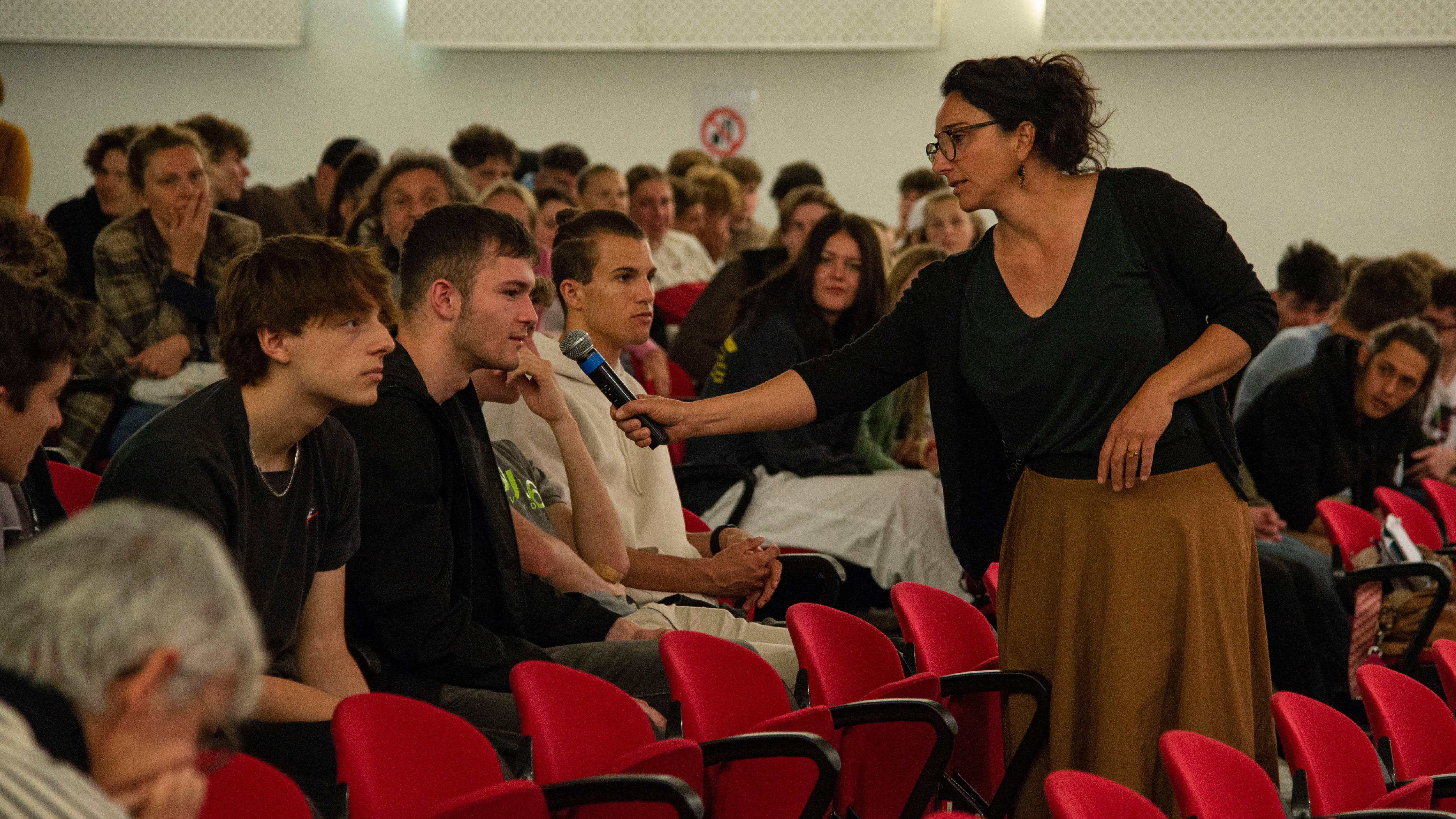 - Die Viertklässler und Maturantinnen und Maturanten der WFO "Kuntner" hatten zahlreiche Fragen an Landeshauptmann Arno Kompatscher und Klimaforscher Marc Zebisch. (Foto: LPA/Fabio Brucculeri) » [IMG 2 MB]