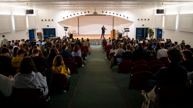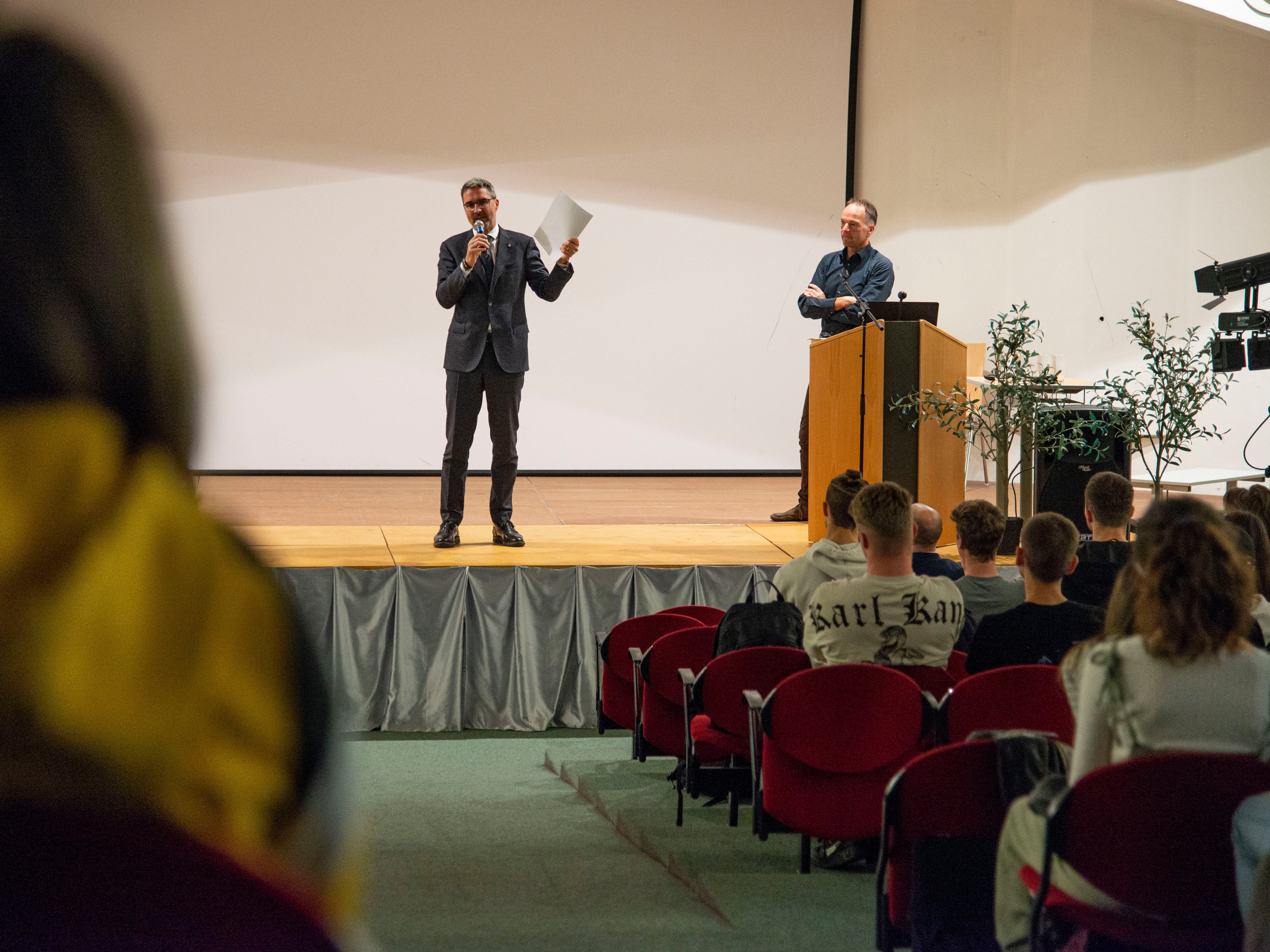 - Vor jeweils voll besetzen Aulen sprach Landeshauptmann Arno Kompatscher an zwei Bozner Oberschulen (hier Realgymnasium "Anich") über den Klimaplan des Landes und stellte sich den Fragen der Schülerinnen und Schüler. (Foto: LPA) » [IMG 2 MB]