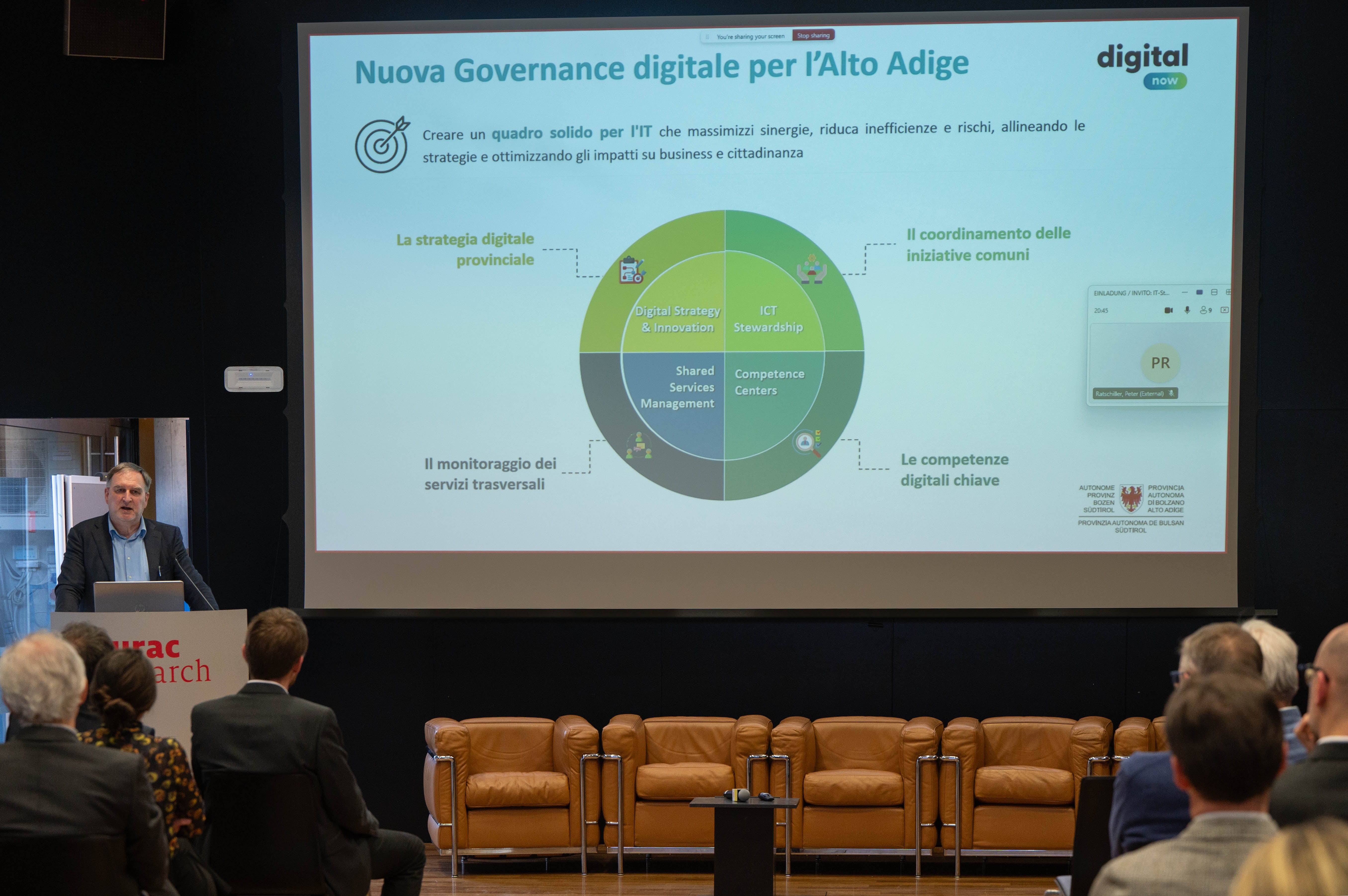 "Wir arbeiten sehr intensiv daran, Südtirol zu einer smarten Provinz zu machen. Derzeit setzen wir über 200 digitale Projekte um, angefangen von den Initiativen Citizen Inclusion und Digi Points bis hin zum einheitlichen Datenzentrum für Südtirol", führte Josef T. Hofer, der Verantwortliche für den digitalen Wandel in Südtirol und Direktor der Abteilung Informatik, einige Beispiel auf. Um das Gesamtziel zu erreichen, nämlich Südtirol fit für die postdigitale Ära zu machen, brauche es eine neue Governance, die sich auf 4 Säulen stütze, und zwar auf themenspezifische Kompetenzzentren, innovative und nachhaltige Strategieentwicklung sowie eine optimale Planung und Koordinierung.
