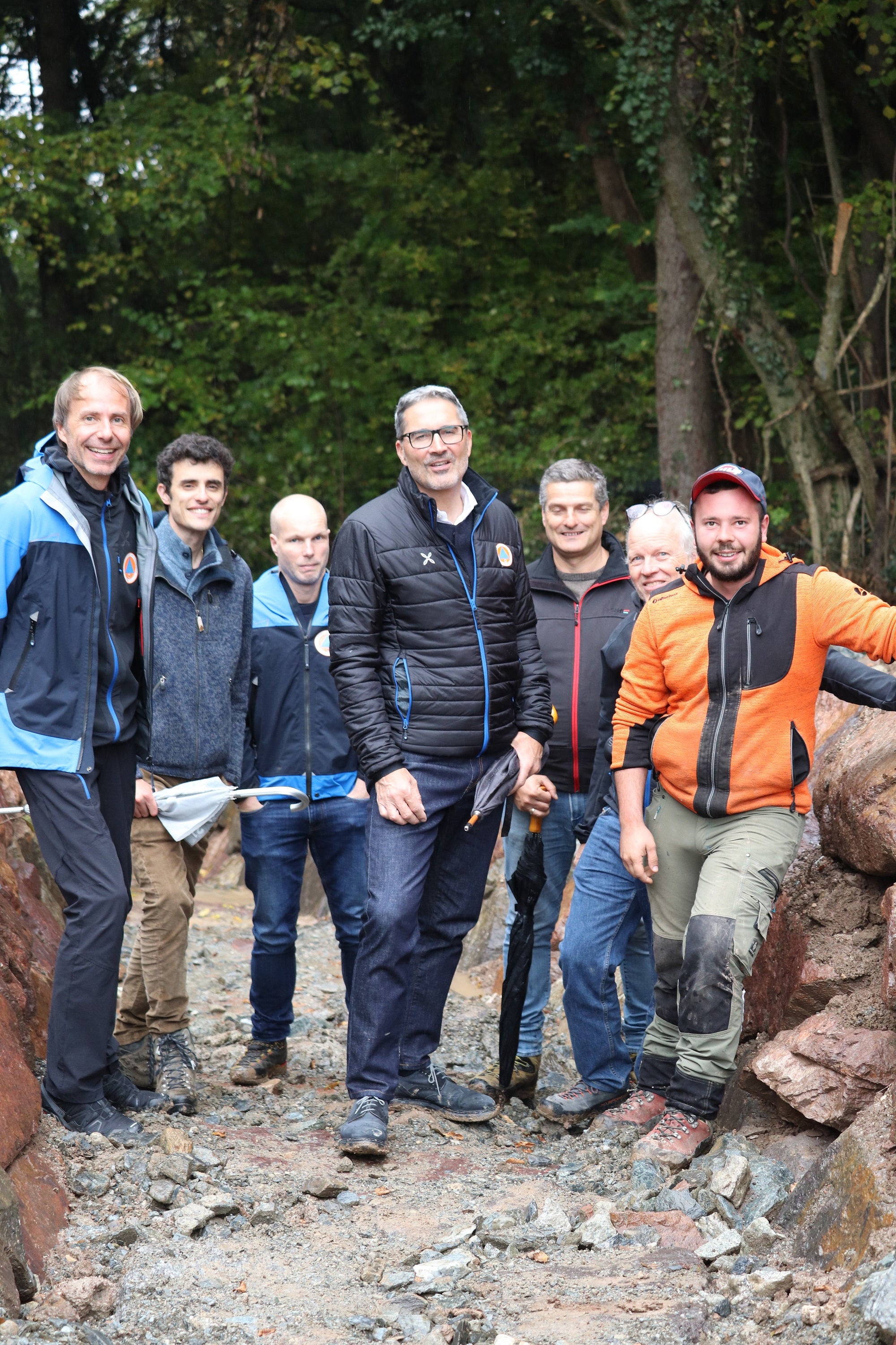 - Lokalaugenschein in Ulten mit (von links) Bereichsleiter Wildbachverbauung Fabio De Polo, Ressortdirektor Ulrich Stofner, Bauleiter Christian Kofler, Agenturdirektor Klaus Unterweger, LH Arno Kompatscher, Bürgermeister Stefan Schwarz, Amtsdirektor Thomas Thaler (Foto: LPA/Maja Clara) » [IMG 467 kB]